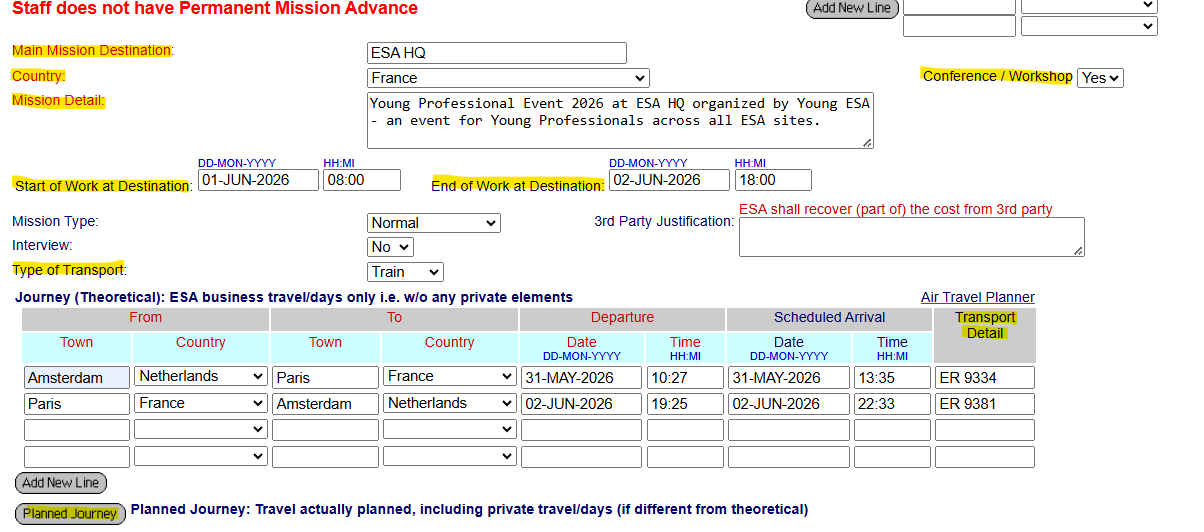 Journey: the nominal journey to reach ESA HQ and come back afterwards (the one approved by your manager)